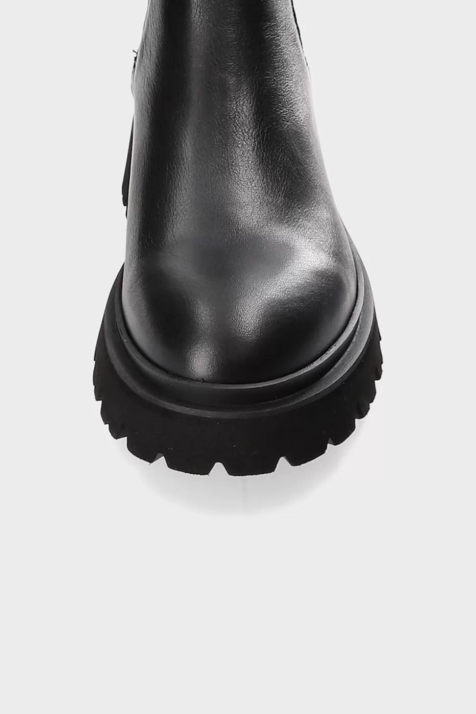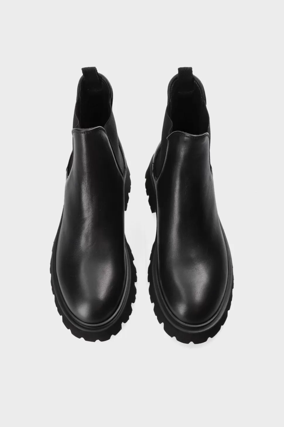 In Het Zwart. Lage Chelsea Boots Gemaakt Van Glad Leer. Minimalistisch Silhouet Met Dikke Elementen. Elastische Zijpanelen. Geborduurde Details. Trek Het Lusje Aan De Achterkant. Iets Taps Toelopend Teengedeelte. Dikke Rubberen Zool Met Dik Loopvlak, Blokhak En Spatbord. Minimalistische Chelsea Boots Met Opvallende Elementen.Materiaal