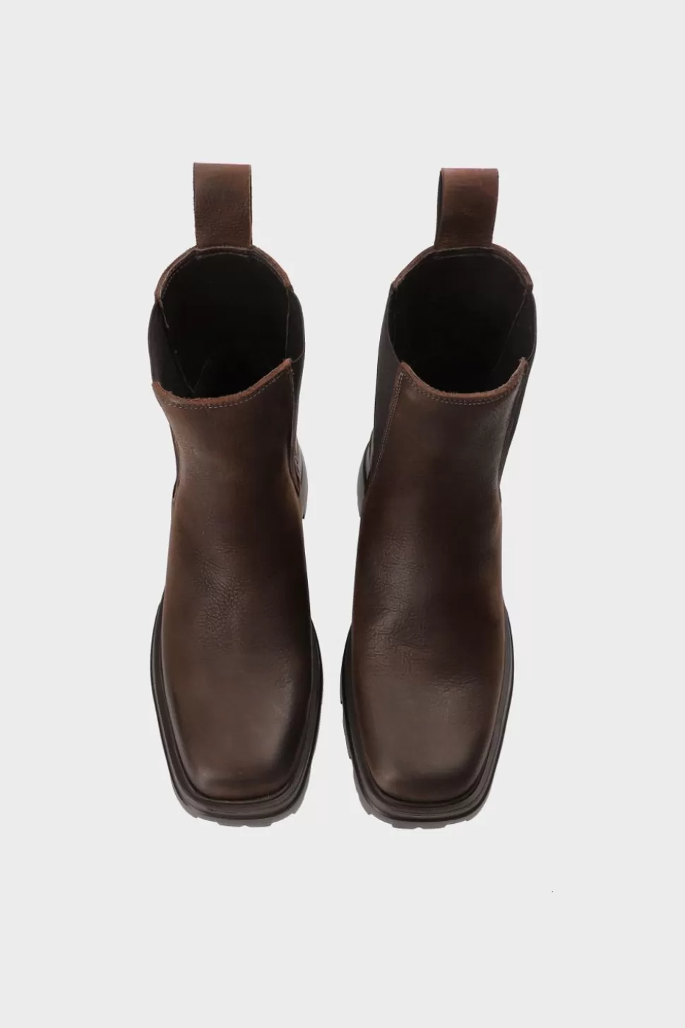 In Chocolade. Enkelhoge Chelsea-Laarzen Gemaakt Van Gewaxt Nubuckleer. Grof Silhouet. Elastische Zijpanelen. Geborduurde Details. Logo Aan De Buitenkant. Trek Het Lusje Aan De Achterkant. Vierkante Zool Met Blokhak En Gripprofiel. Opvallende Chelsea-Laarzen Met Vintage Elementen.Onze Schoenen Zijn Ontworpen In Kopenhagen En Gemaakt In Europa. Het Leer Is Afkomstig Van Geselecteerde, Door Een Familie Gerunde Fabrieken In Italië.
