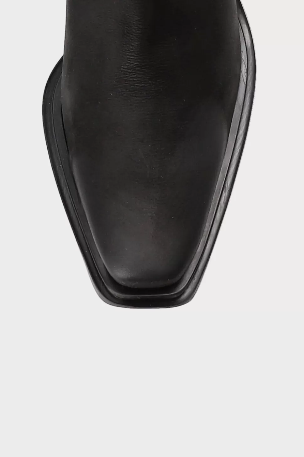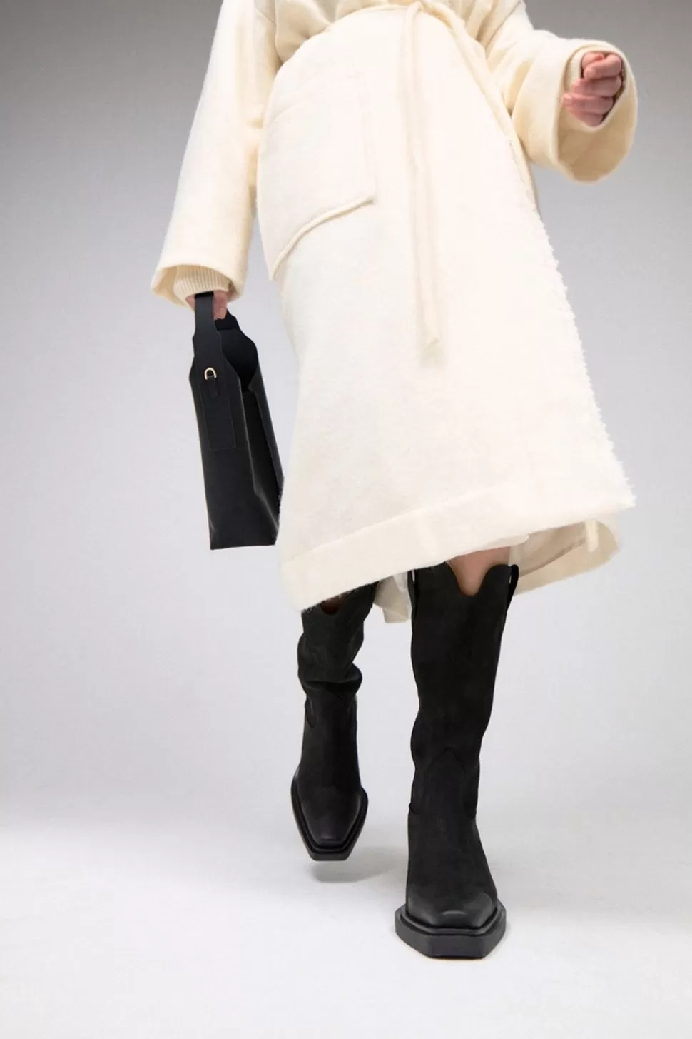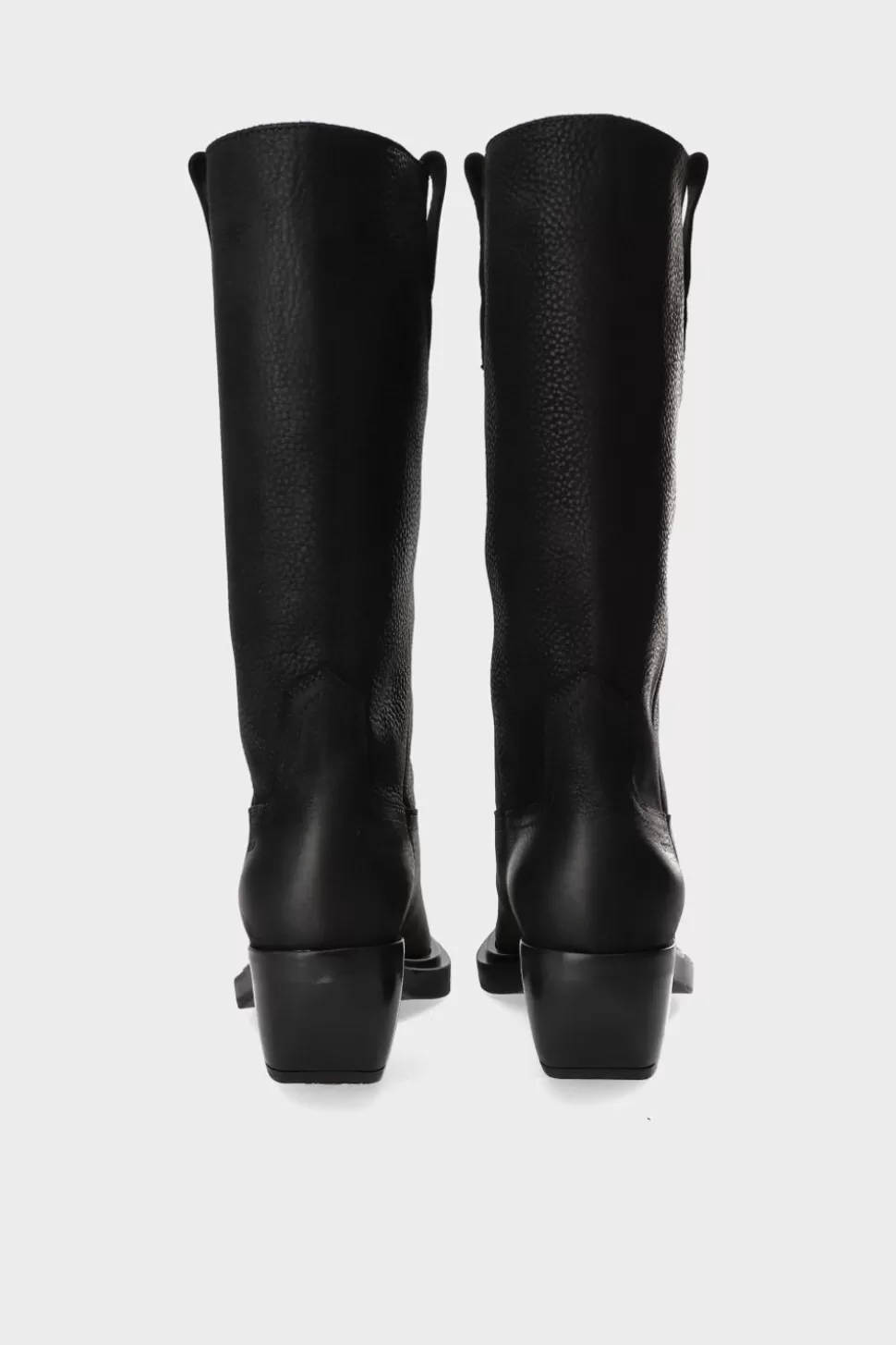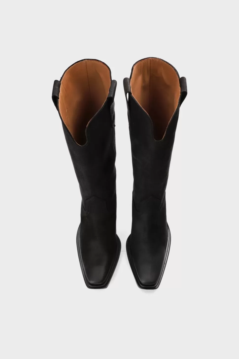 In Het Zwart. Hoge Laarzen Gemaakt Van Gewaxt Nubuckleer. Texano-Geïnspireerd Silhouet. Brede Schacht. Geborduurde Details. Logo Aan De Buitenkant. Rechthoekig Gevormd, Puntig Teengedeelte. Trek Het Lusje Aan De Achterkant. Gladde Rubberen Zool Met Schuine Blokhak. Minimalistische, Elegante Texano-Enkellaarzen In Een Monochrome Look.Onze Schoenen Zijn Ontworpen In Kopenhagen En Vervaardigd In Europa. Het Leer Is Afkomstig Van Geselecteerde, Door Een Familie Gerunde Fabrieken In Italië.
