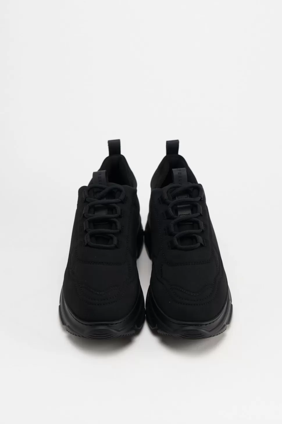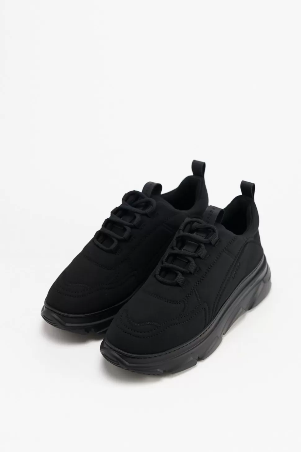 In Het Zwart. Lage Sneakers Gemaakt Van Een Mix Van Gerecycled Neopreen. Grof Silhouet. Contrasterende Elementen Met Geborduurde Details. Vetersluiting Aan De Voorkant. Logopatch Op De Tong. Subtiele Branding Aan De Buitenkant. Trek Het Lusje Aan De Achterkant. Ronde Dop. Dikke Platformzool Met Geometrische Details. Onze Iconische Sneakers In Een Nieuw Jasje.Materiaal