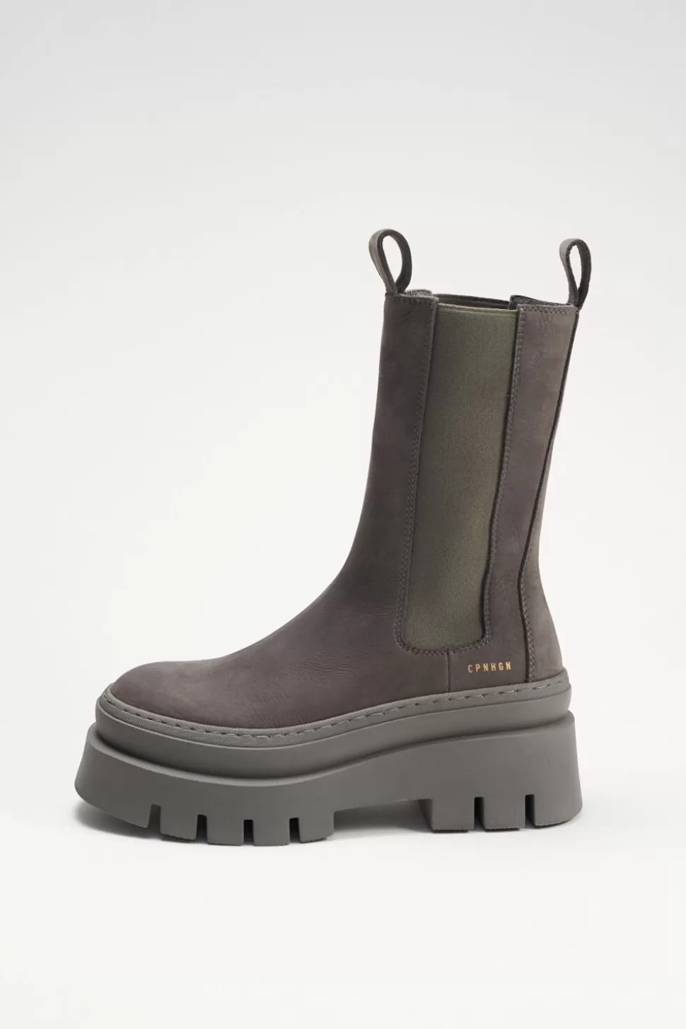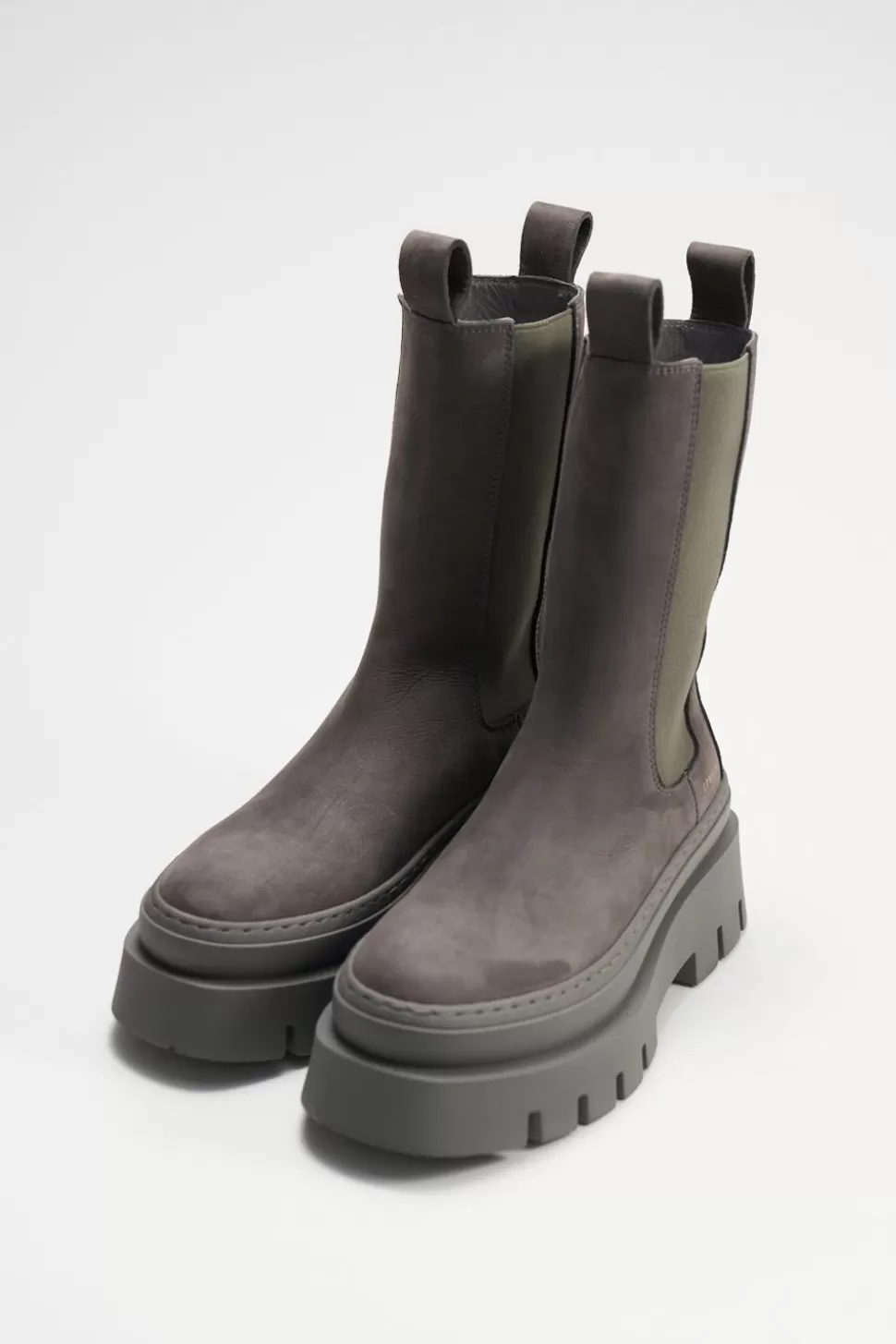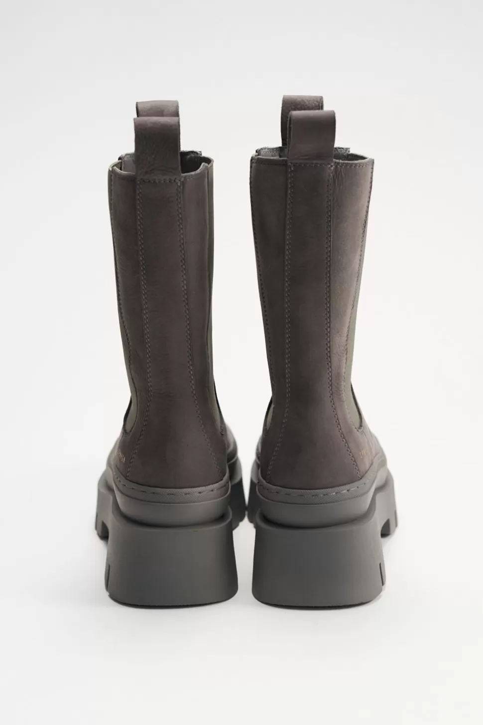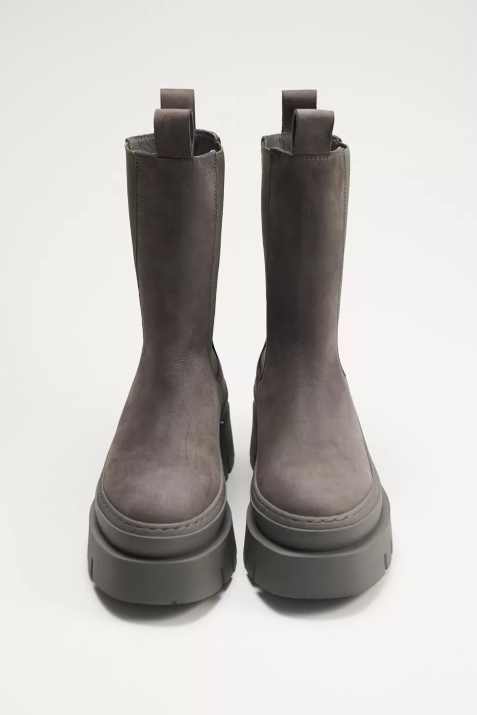 In Grijs. Middenhoge Chelsea Boots Gemaakt Van Zacht Nubuckleer. Langwerpig Chelsea-Silhouet. Ronde Dop. Elastische Inzetstukken. Twee Treklussen Op De Schacht. Goudkleurig Logo Aan De Buitenkant. Een Monochrome Stijl Met Expressieve Details.Onze Schoenen Zijn Ontworpen In Kopenhagen En Gemaakt In Europa. Het Leer Komt Uit Geselecteerde, Door Een Familie Gerunde Fabrieken In Italië.